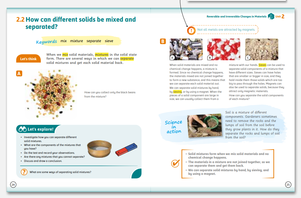 Візьмемо для прикладу урок з підручника Science Primary від видавництва Vector Maths&Science на тему «How can different solids be mixed and separated?». Кожен етап уроку тут надає можливість для дитини самостійно вибудувати шлях до розв’язання задачі.