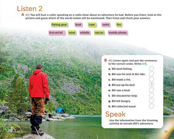 Перш ніж натиснути кнопку відтворення, мозок учня має «побачити» історію. Ваша мета викликати емоційний відгук та активувати фонові знання про відпочинок на природі та можливі небезпеки. Попросіть дітей подивитися на фото людини в червоній куртці біля озера. Запитання на кшталт: «Where is this man? What is he doing? What could happen to him in such a place?» спонукають учнів до прогнозування.